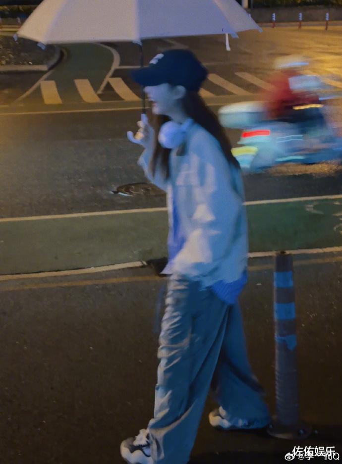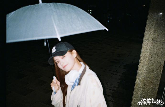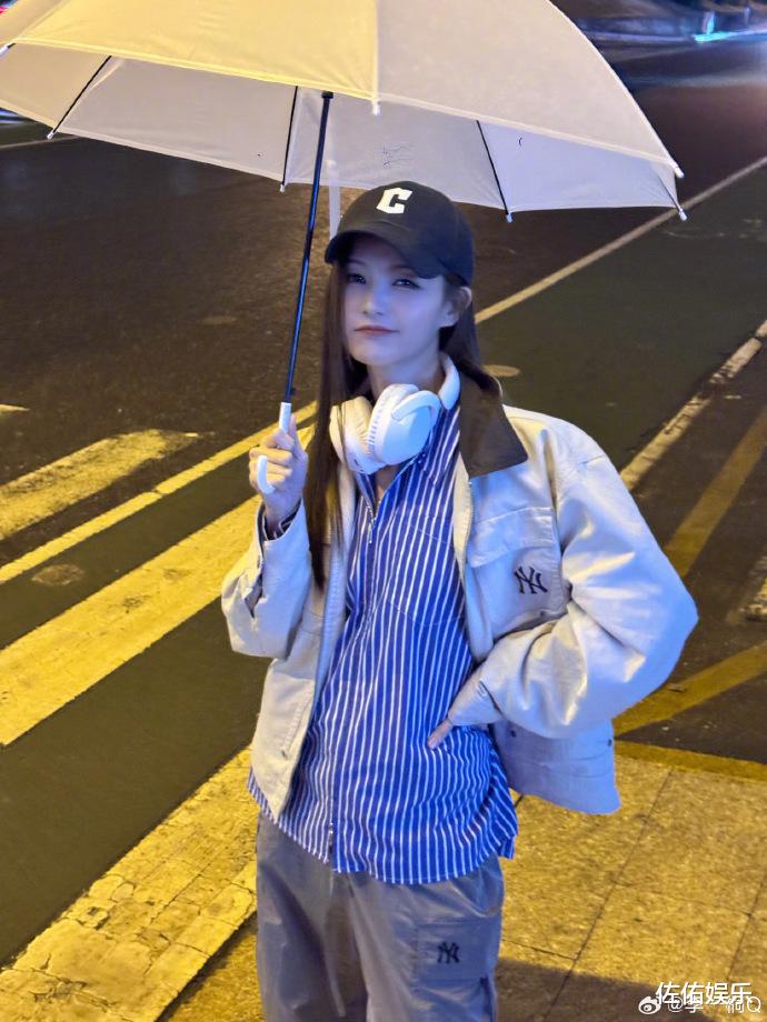她眼神明亮且略带笑意,嘴角微微上扬,既展现出她甜美的气质,又不失大方与洒脱。李一桐一手稳稳地握住白色雨伞的把手,另一只手插在裤兜,不仅显得随性自然,还为整体造型增添了几分帅气与不羁。