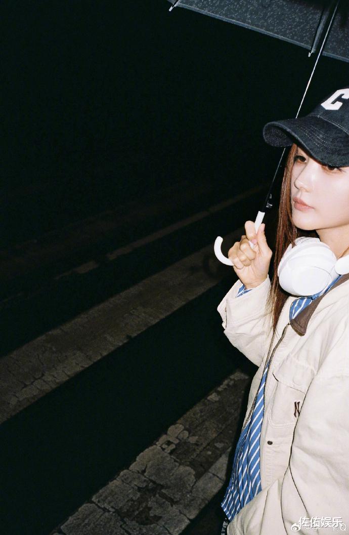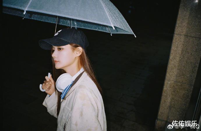 李一桐侧着脸,表情里带着一丝清冷和淡然,与雨夜的静谧氛围相契合,给人一种安静又神秘的感觉。她手持透明雨伞,伞面上有水珠滑落,进一步强化了雨夜的情境,光线柔和地洒在她身上,形成明暗对比,突出了她的轮廓,同时也增添了画面的层次感和艺术感。