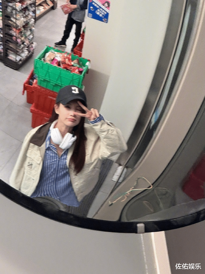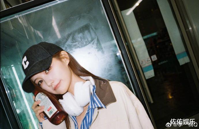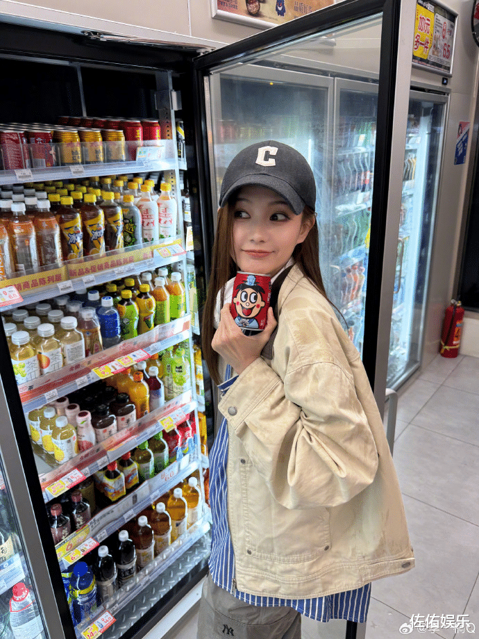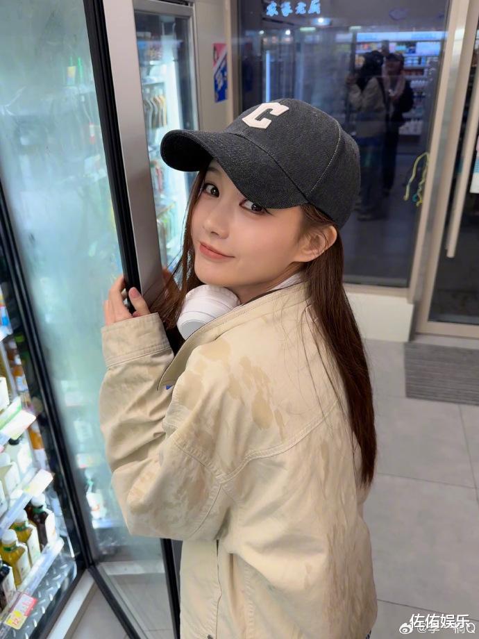 画面中的李一桐穿着米白色的外套简约大方,头戴带有白色字母 “C” 的深色棒球帽,脖子上挂着的白色耳机,透露着时尚潮流的气息。她那自然垂下的长发,为整体造型增添了柔美之感,一手扶着冰柜,身体微微扭转,侧脸看向镜头,眼神明亮且带着笑意,表情自然亲切,给人一种毫无距离感的亲和力,瞬间拉近了与观者的距离。