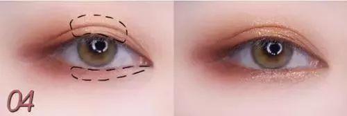 step4:在上眼睑的中间和下眼睑的内眼角至中间区域涂抹上金咖色珠光眼影