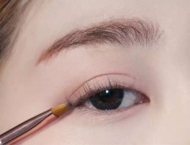 Step4:用眼影刷蘸取灰棕色眼影,沿着上眼睫毛根部晕染。