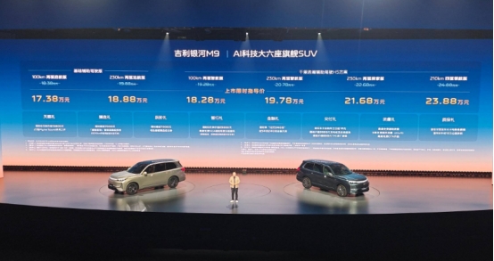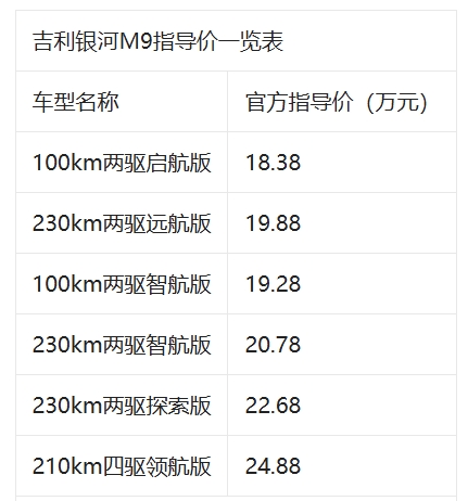 显然,它没打算直接挑战理想L9或者问界M9。吉利很聪明,没去40万以上的高端市场硬碰硬,而是稳稳地把价格锚定在20万级别。来看具体定价: