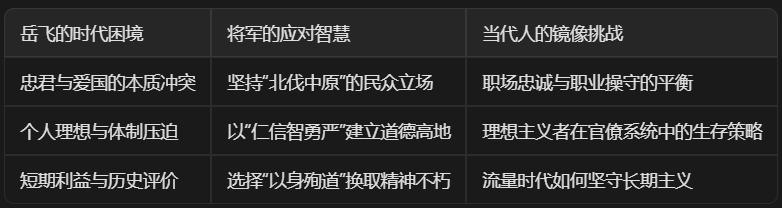 这场修行的本质,是将岳飞的悲剧精神转化为现代人的生存智慧。当你能在绩效考核中坚守专业伦理,在集体沉默时发出理性声音,便是对“精忠报国”的当代诠释——不是重复他的命运,而是继承他那种“存吾道以还天地”的生命气度。
