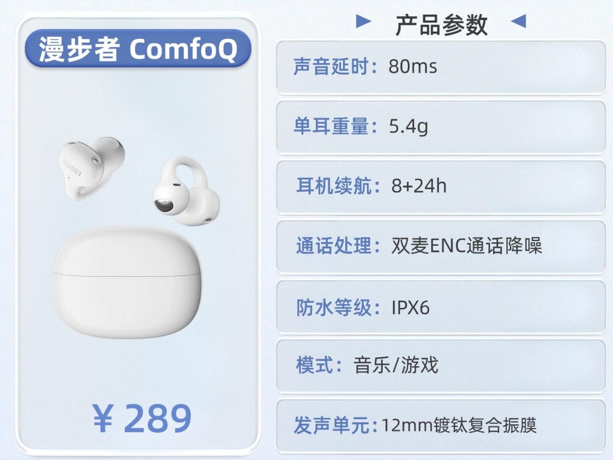 漫步者这款耳机佩戴舒适度挺高的,小圆头搭配多曲度软梁设计,特别贴合耳型,佩戴稳定性很好;单耳仅 5.4g,重量很轻,长时间佩戴也不容易觉得累。