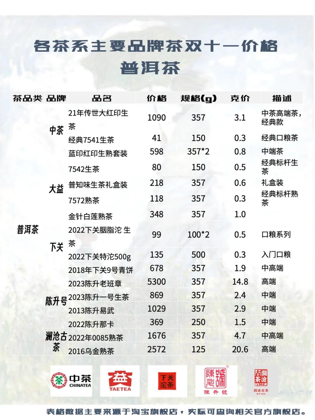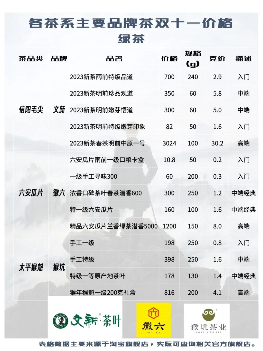 之前整理了各类茶主要品牌,让新手茶友们能大致知道可以找什么牌子。收到很多茶叶的回复问我价格,有鉴于此博主对各品牌主要产品及其低中高档产品价格做了一个简单的整理,希望对各位茶友们也有参考作用。