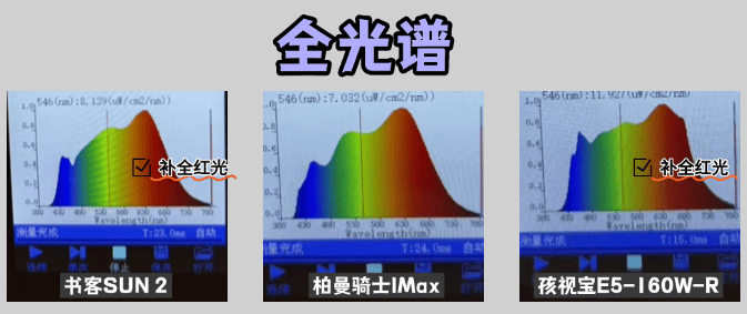 最后则是孩视宝E5-160W-RS,这款护眼大路灯虽然也补全了红光,但是实际蓝光接近0.8左右,相对其他两款来说,整体的表现比较一般。