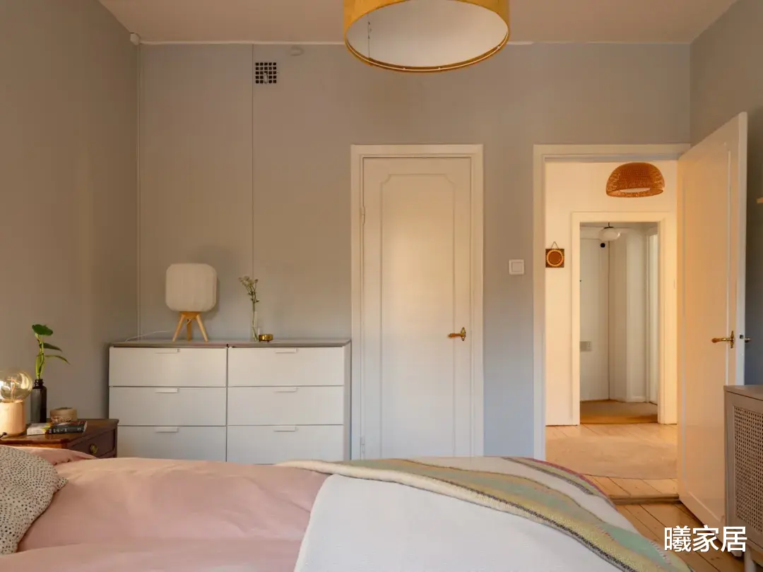 窗户非常通透,阳光洒进来的时候让整个房间无比温暖。并且阳光洒在床上的感觉,加上藤编柜子的度假感,视觉上简洁的同时又很温馨。还有隐藏在角落的储物间,开放式的衣柜系统实用又美观。