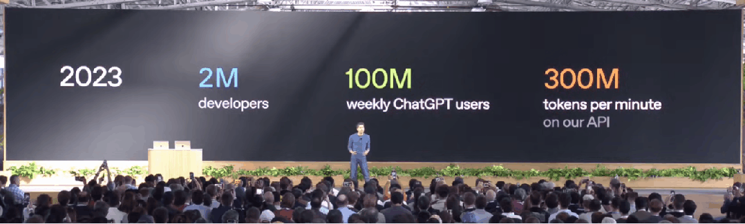 Keynote 一开场,山姆・奥特曼便分享了 OpenAI 这两年取得的成绩:400 万开发者、8 亿周活 ChatGPT 用户、API 每分钟 60 亿 token 消耗量。
