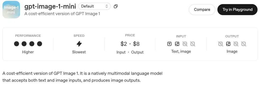 另外,OpenAI 也为 GPT Image 1 模型打造了一个 mini 版本。它是一种原生多模态语言模型,可同时接受文本和图像输入和生成图像输出。以下截图展示了其一些参数和定价信息: