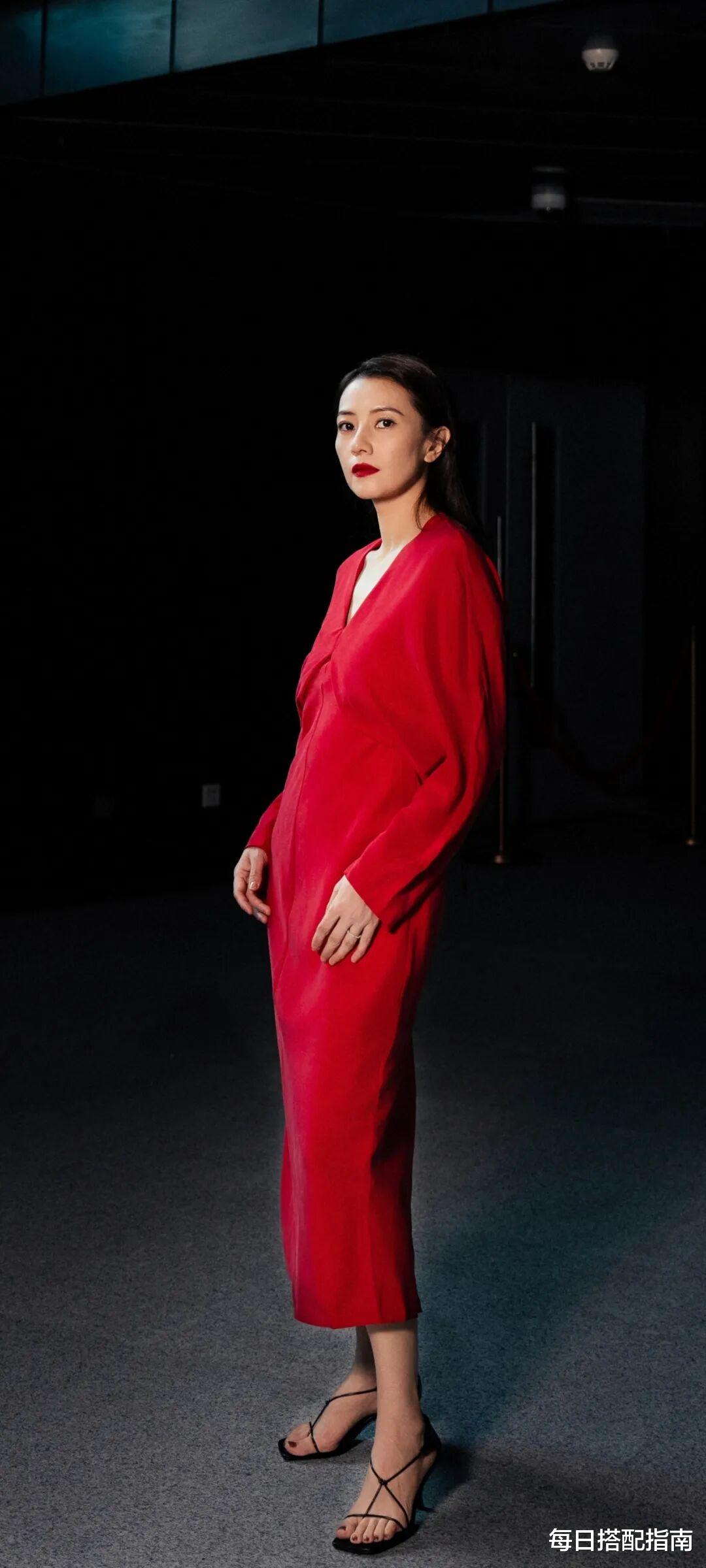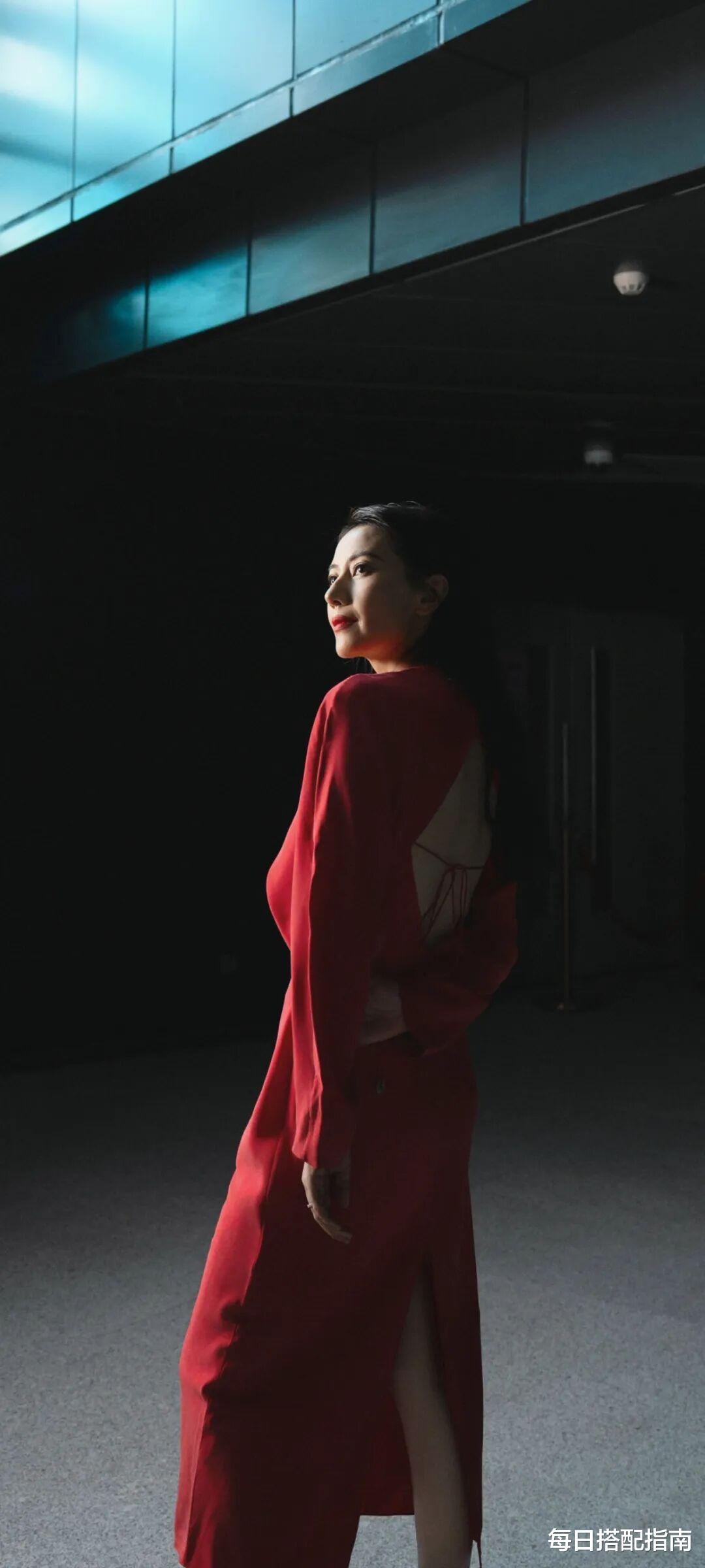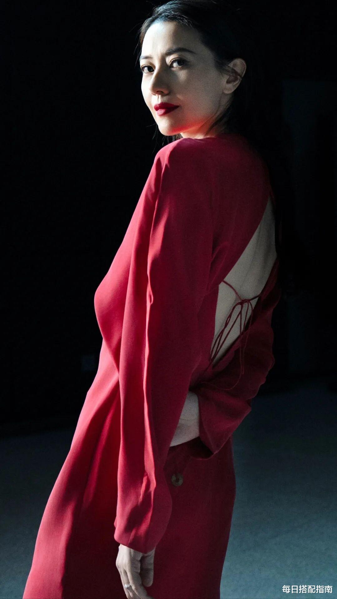 她没有繁复的配饰,没有过度的妆发,而是用干净的背景衬托出红色的纯粹。成熟女性在穿搭中完全可以借鉴这一思路:当你选择了亮色,就学会做“减法”。
