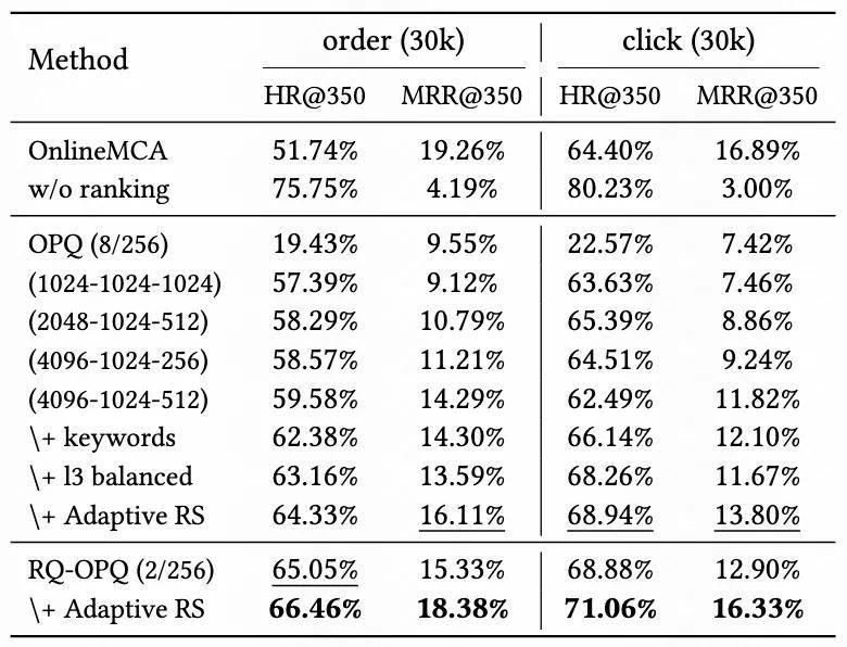 基于线上真实用户行为日志构建的离线测试集表明,OneSearch 提出的 RQ-OPQ 编码与自适应奖励系统相结合的方法效果最优,相比现有级联式系统(OnlineMCA),各项指标均有显著提升。