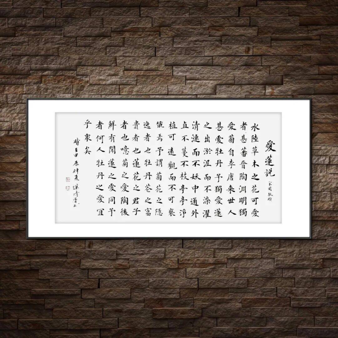 观李谟清老师之楷书,端雅方正,笔笔精到。既有欧阳询风骨,又有褚遂良笔意。每一个字都似精心雕琢的玉璧,结构严谨而不失灵动。横画如千里阵云,舒展平稳;竖画若万岁枯藤,挺拔坚韧。撇捺之笔,开合有度,既具楷书的规整,又含行书的飘逸之姿。在书写过程中,李老师对线条的控制精准入微,墨色浓淡相宜,浓处如漆,尽显厚重;淡处若雾,更显空灵。这种对墨色的巧妙运用,为楷书作品增添了层次与韵味,使静态的文字焕发出动态的生机。他书写的《爱莲说》,将周敦颐笔下莲花“出淤泥而不染,濯清涟而不妖”的高洁之态,通过楷书的端凝与墨色的变化,悄然传递给观者,让人体会到文字与书法艺术相互交融的妙趣。