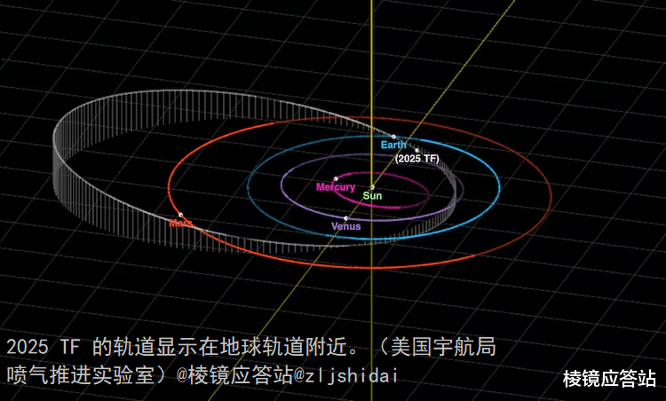 2025TF的轨道呈显著的椭圆形,其半长轴约为1.62天文单位,近日点深入金星轨道内侧,距离为0.676AU,远日点伸展至火星轨道外侧,距离乃是2.56AU,轨道周期大概是2.06年轨道倾角约为9.1度。