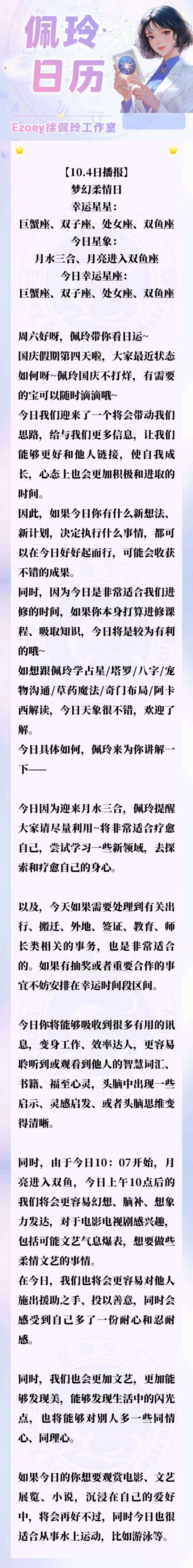 今日因为迎来月水三合,佩玲提醒大家请尽量利用~将非常适合疗愈自己,尝试学习一些新领域,去探索和疗愈自己的身心。