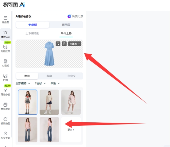 对于那些有自己专属模特的商家来说,这个功能你也可以用,易可图支持上传自己的专属模特图,进行模特换装,这样你就不用每件衣服都去重新拍摄一遍了。