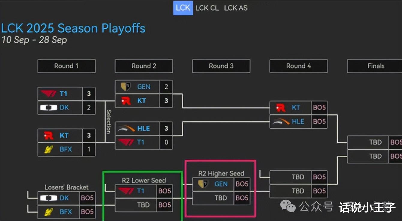 LCK由于今年赛制改革,他们是没有冒泡赛的,季后赛前四也就是世界赛种子名额。知道这个规则之后再来观看LCK相关赛程,T1现在是败者组第2轮,GEN是败者组第3轮。这就意味着LCK最后一个世界赛名额将会在DK,BFX和T1中产生,不过这最后一张门票大概率会是T1。