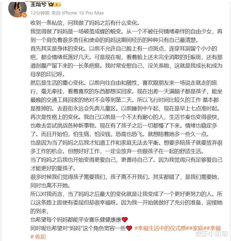 6月5日,杜淳妻子王灿在个人社交平台发长文分享了自己当妈后的变化,当然这次的分享也是应粉丝要求。王灿的这次分享可谓非常的用心了,从身体、生活重心、性格、情绪等多个角度分析了当妈妈后自己的变化。这种变化估计真的只有经历过才能懂得,王灿的分享也是引发不少妈妈们的共鸣。