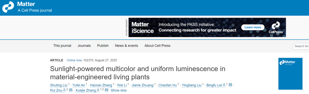 最终,相关论文以《阳光驱动的多色且均匀发光的材料工程活植物》(Sunlight-powered multicolor and uniform luminescence in material-engineered living plants)为题发在 Matter。
