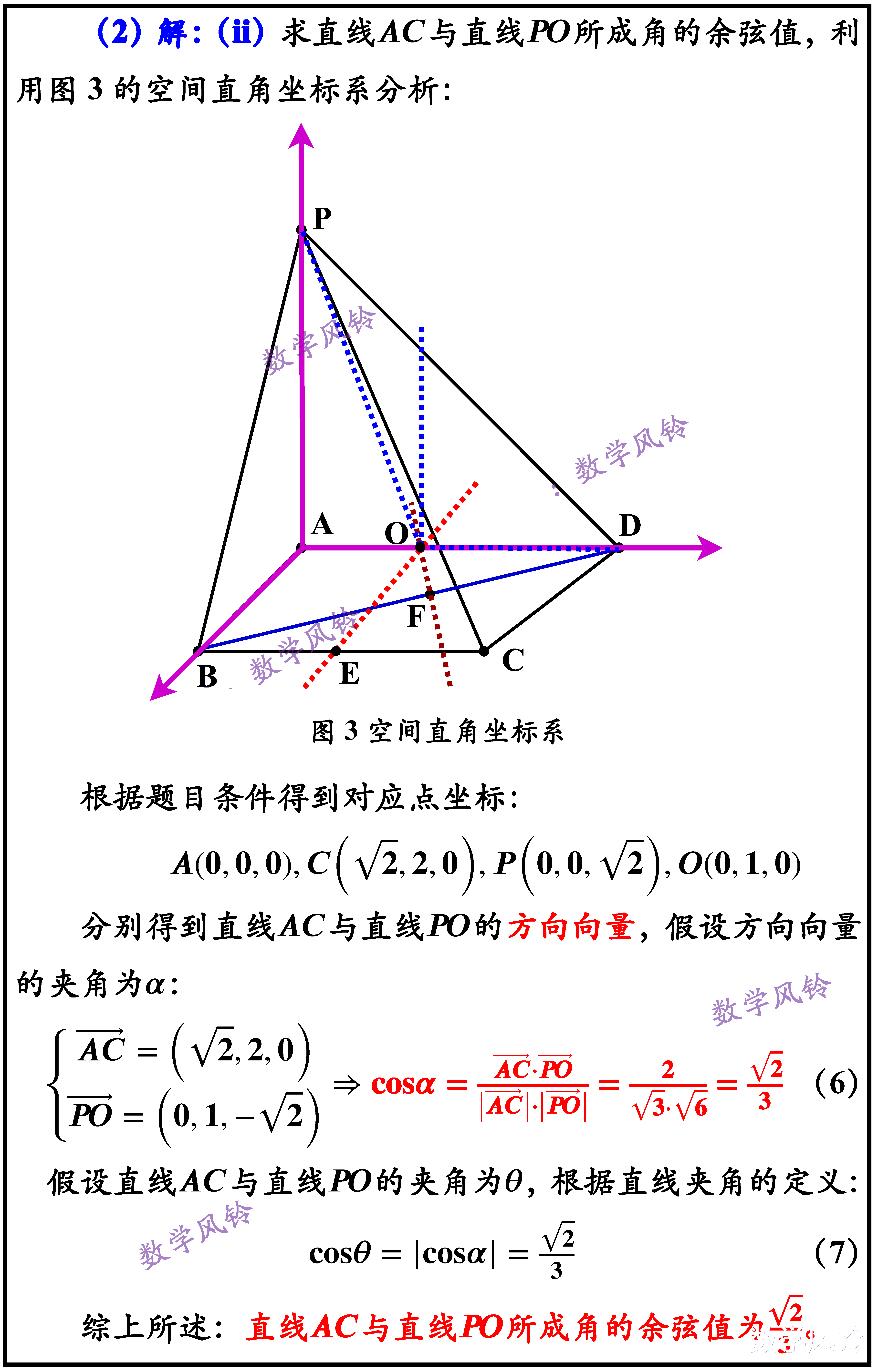 按照上述步骤结合平面辅助法先求解底面三角形的外心,其中在求解三角形边的中垂线时,用到了直线的点法式方程(已知直线的方向量和直线过的定点),不用按部就班求斜率,写点斜式方程,这也是一个做题技巧。联立中垂线方程得到外心坐标;假设球心位置,利用外接球的性质得出球心坐标(与外心重合),最后利用空间直角坐标系,通过直线的方向向量求出对应直线夹角的余弦值。本质算是一道非常经典的立体几何题目,值得深入研究学习。