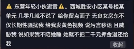 据新闻消息,1月2日,一住在山东东营圣安小区的小伙租户,在网上发布消息,称自己被女房东长期骚扰。据消息了解,该名女房东应该是离婚状态,经常跟小伙发送黄色视频和一些污言秽语,这让这位年轻小伙不堪忍受,想要搬离,可女房东却威胁他说如果不陪她睡觉就不退还押金,让小伙愤怒又无奈,最终选择在网上曝光。在采访中小伙称:这不是钱多钱少的问题,她就是太恶心了!