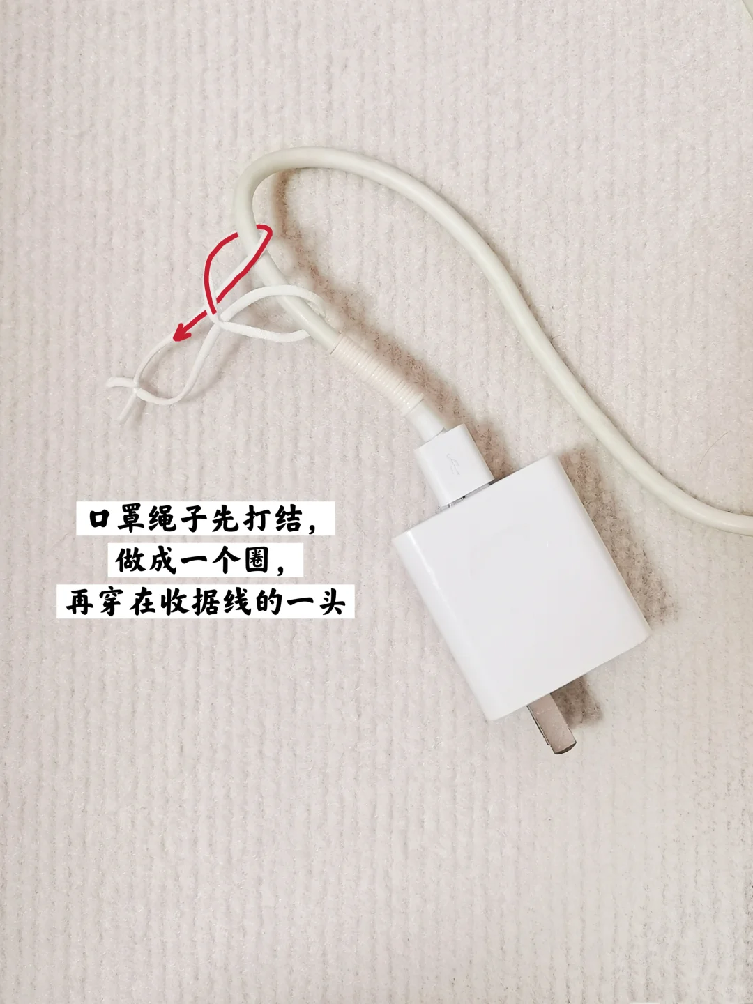 口罩绳子还可以固定充电线,主要它还是带弹力的,来绑数据线就再合适不过了。先把口罩上打一个结做成一个圈儿,然后穿在数据线的一头。
