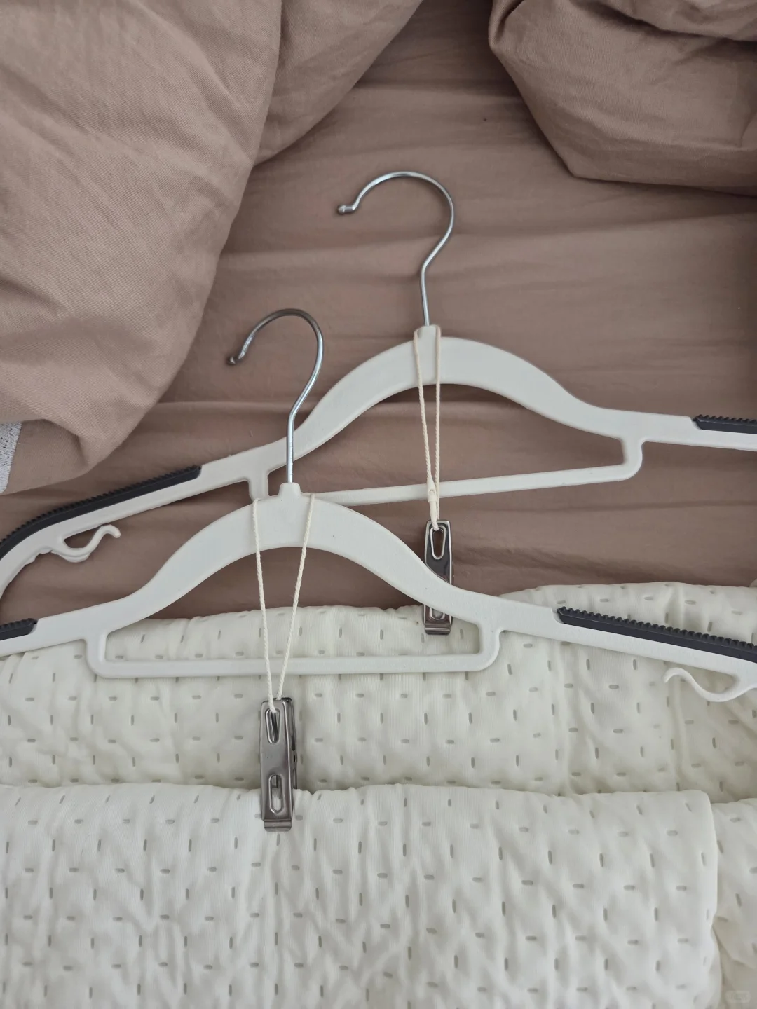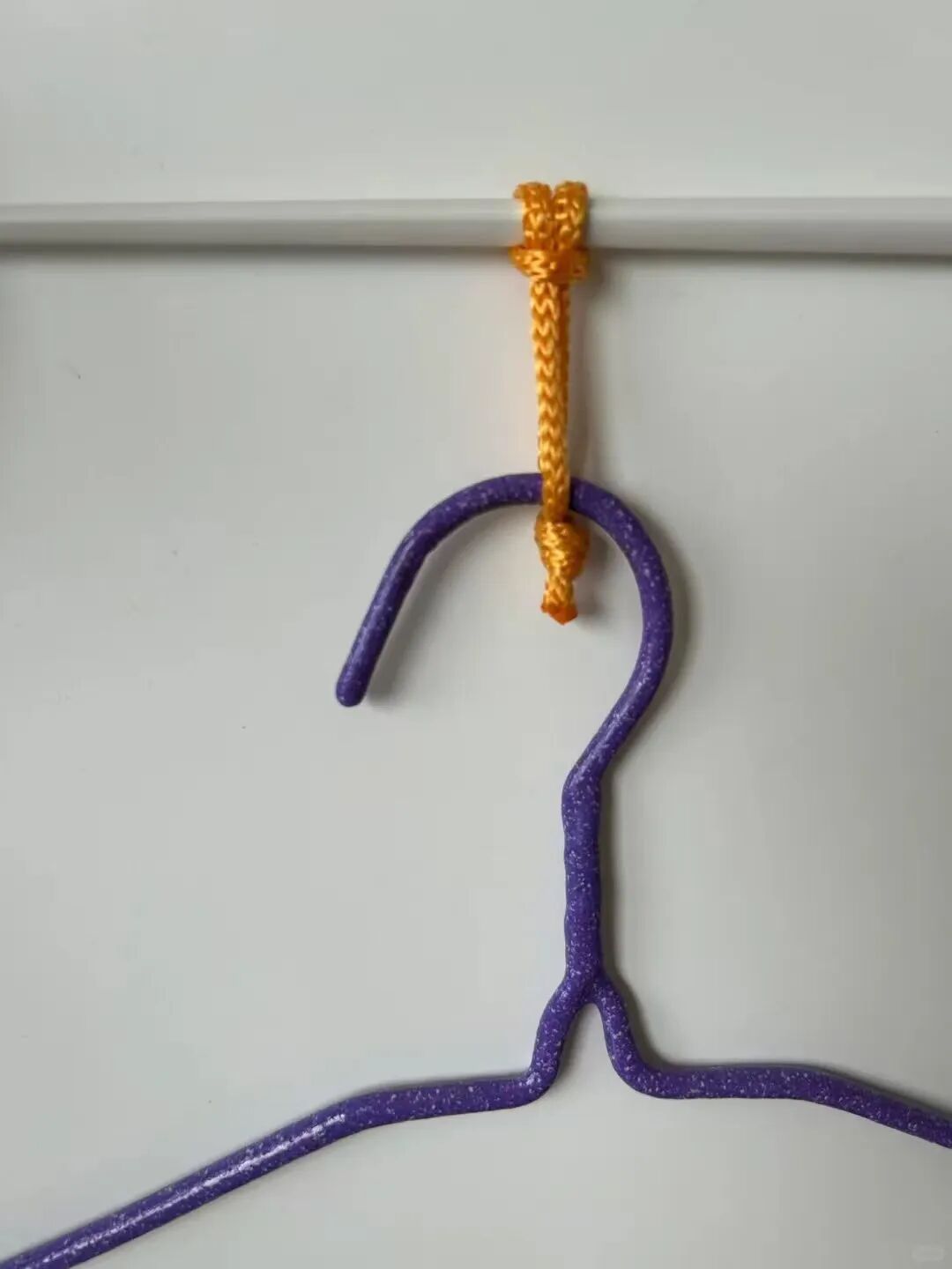 我们可以把它挂在衣架的挂钩上,然后再拴上一个夹子,这样就能使挂在衣架上的衣物更加牢固了。