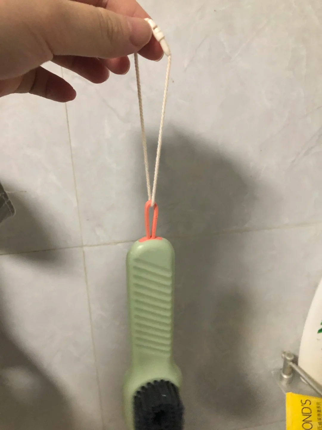 还可以把这些小绳子拴在带挂孔的家居用品上,然后实现上墙收纳。比如拴在鞋刷上,再把鞋刷直接挂在卫生间的墙上就可以了。