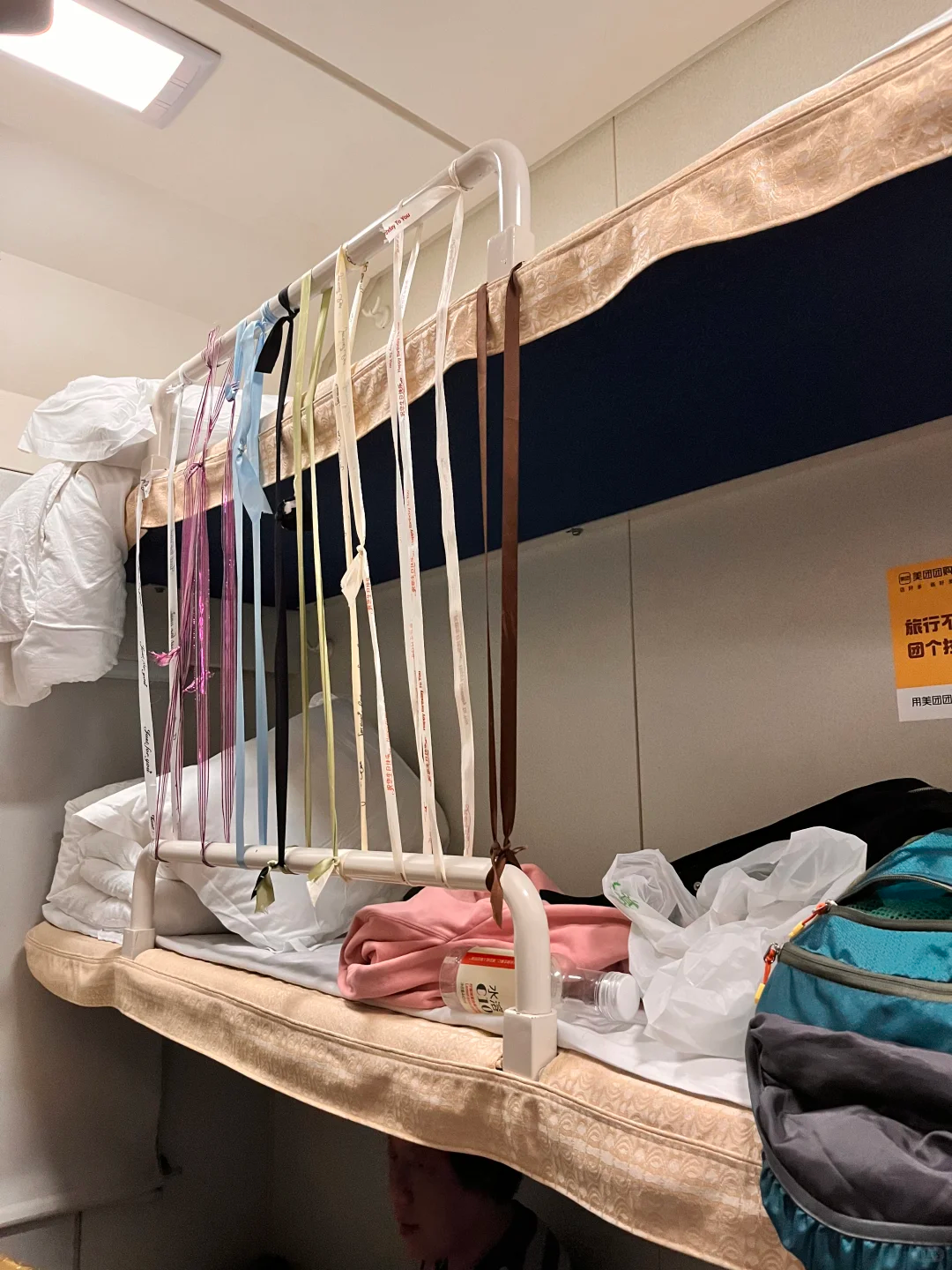 将这些绳子绑在中铺和妈妈所在上铺的把手上,起到围栏的作用。妈妈也能安心地一觉睡到天亮了,简直太聪明了。