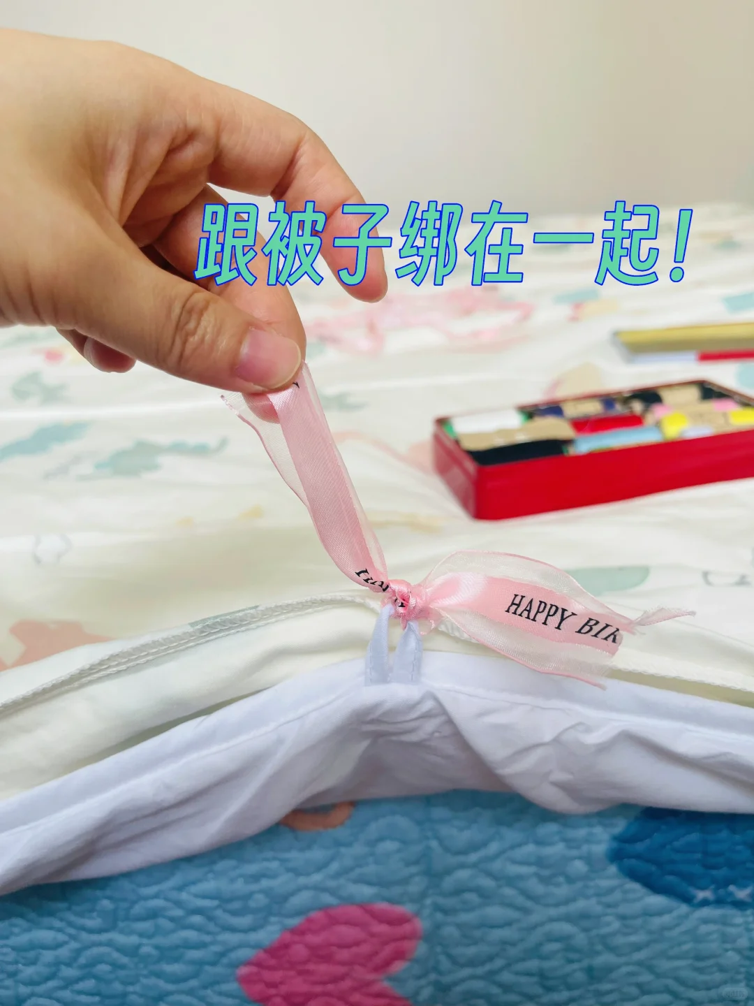 裁剪下来一小段,然后缝在被套里,拴在被子四周的扣眼上,从此以后被子被牢牢固定,任你睡觉再不老实也不会乱跑了。