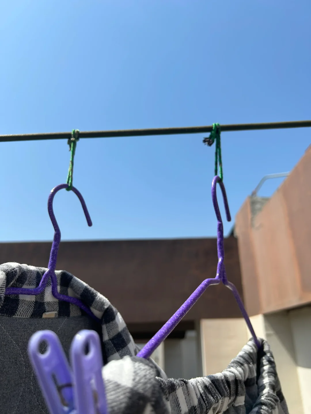 我们可以在挂衣服的铁丝上绑一个提手绳子,然后把衣架挂在绳子上面,就没有那么容易被刮跑了。