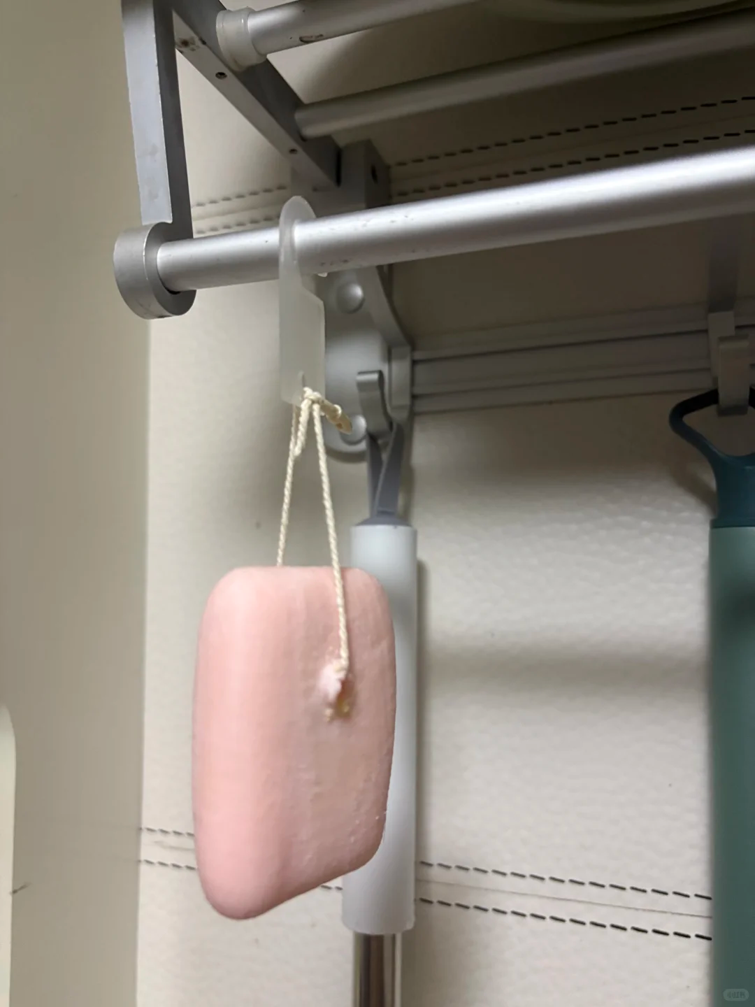 你还可以在香皂的中间串个口,然后把吊牌绳子穿进香皂,然后搭配一个买袜子时赠送的透明的小挂钩就可以挂在毛巾架上了,这样一来香皂干干爽爽的也不会被闷,还没有积水。