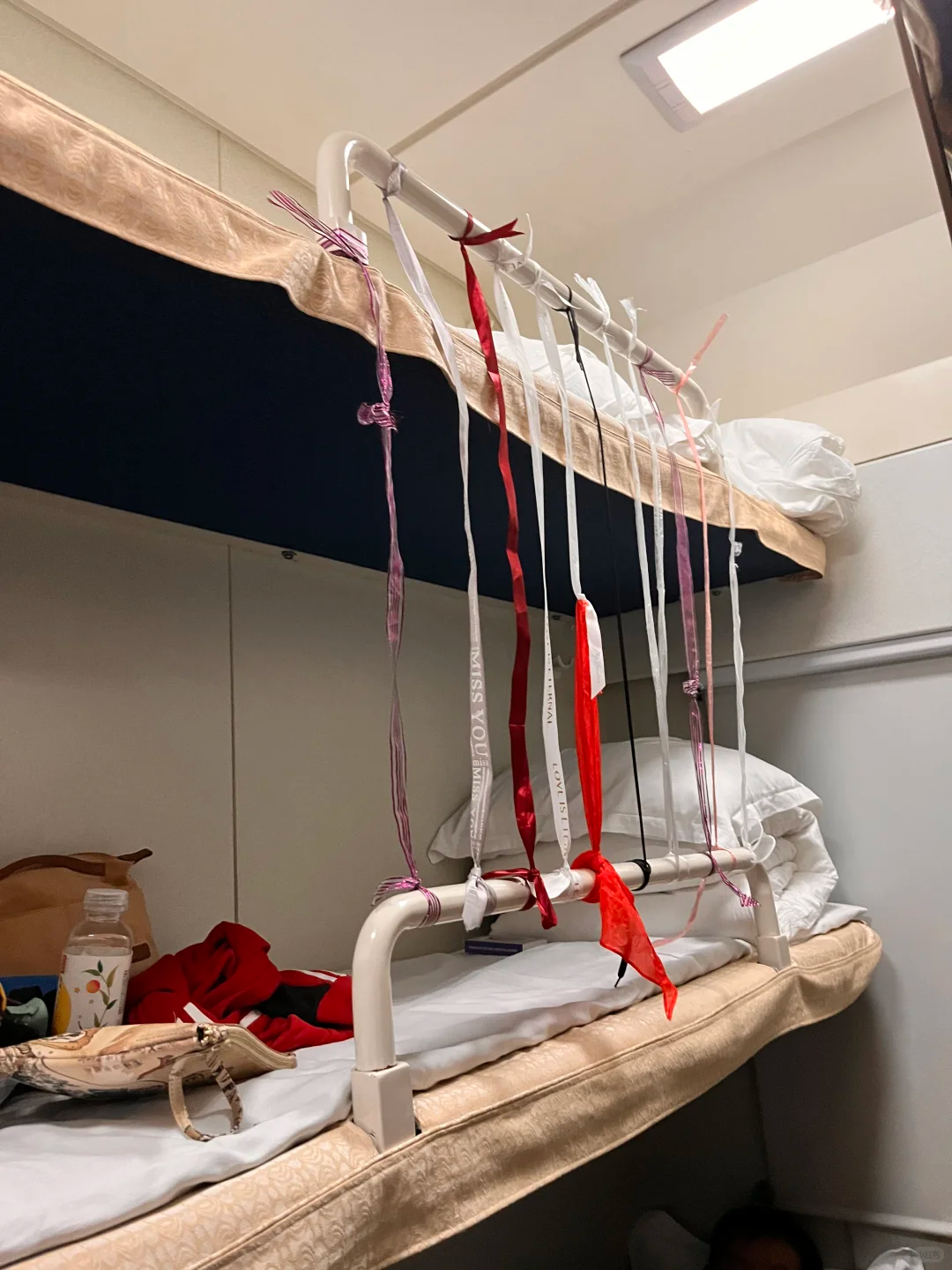 孩子被安排在中铺,但是担心睡觉的时候不老实会掉下去,妈妈灵机一动准备了几个蛋糕包装绳子,