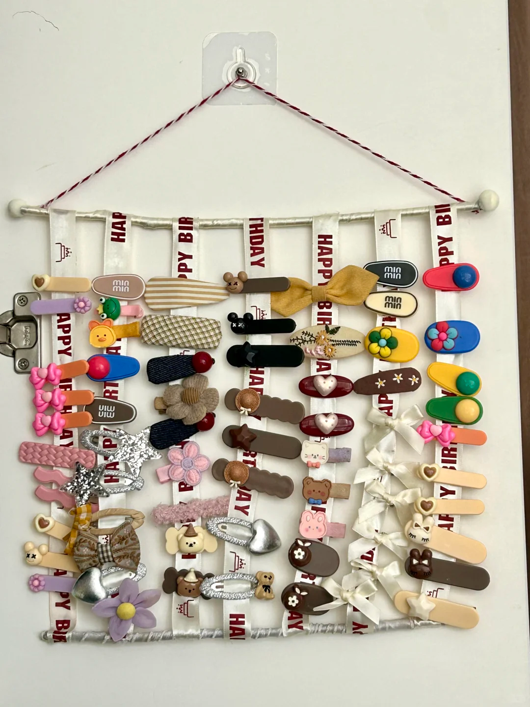 最后就可以把发卡通通夹在蛋糕包装袋上,然后挂到墙上收纳就可以了。