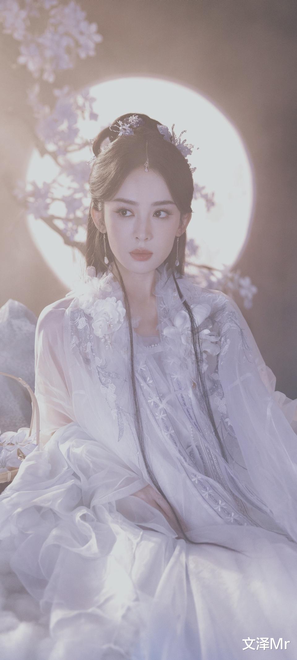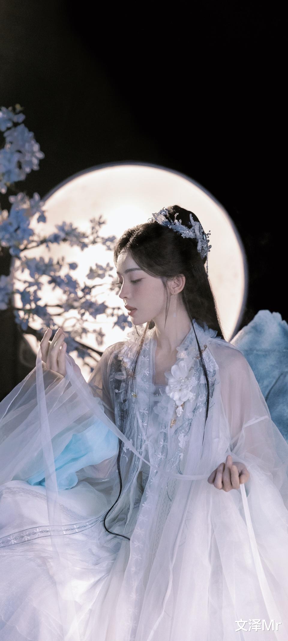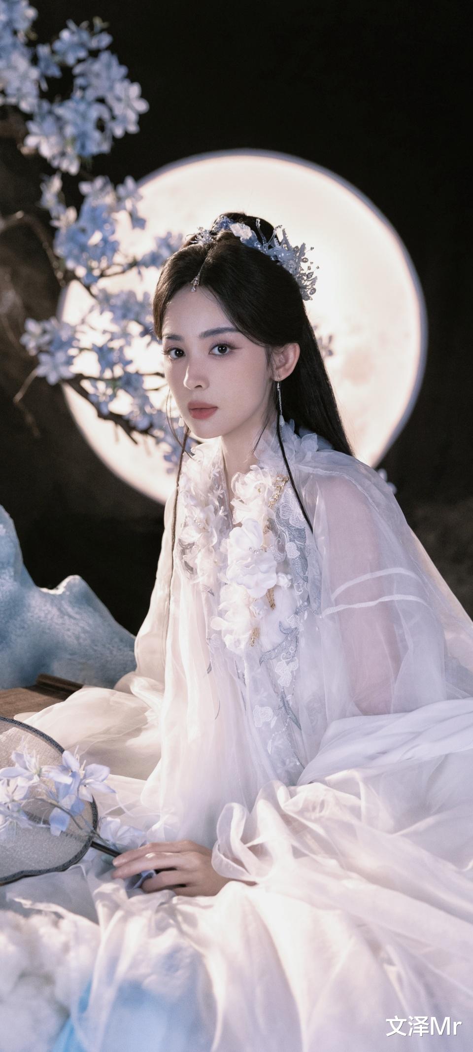 娜扎端坐于 “云端”,身后圆月如盘,花枝摇曳。此时她的古装,像是把天空的澄澈与云朵的洁白都穿在了身上。她既有着仙子的飘逸,又多了几分人间的鲜活,仿佛是从仙境降临,却又带着对世间的好奇与温柔。