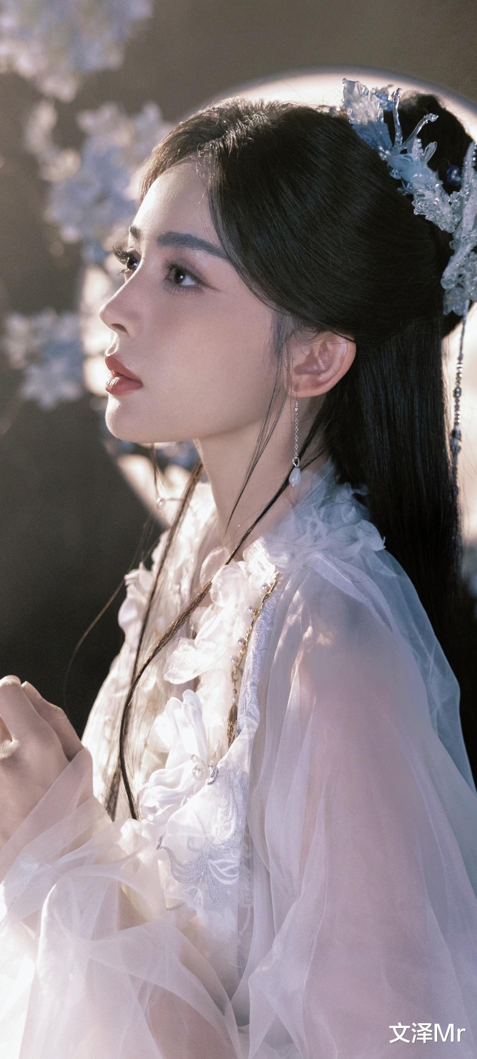 她微微颔首,双手交叠的仪态堪称古典美人范本。白色的纱裙层层叠叠,在光影下泛着柔和的光泽,领口处的花朵装饰为整体造型增添了灵动与精致感。这一身把她的柔美身段勾勒得恰到好处,既不会过于张扬,又能让人瞬间捕捉到她的美,就像一首舒缓的抒情诗,慢慢浸润人心。