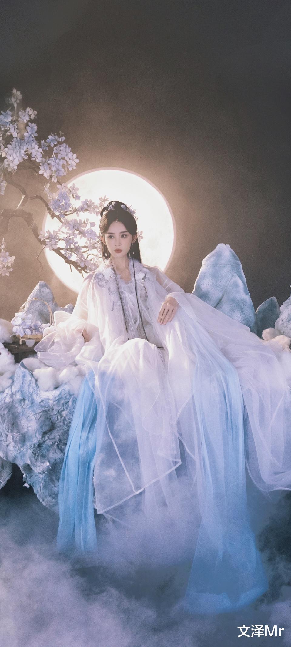 渐变蓝裙摆如泼墨山水,坐在"冰石"上的娜扎展现了惊人的肢体表现力。那长长的纱裙,从 “云端” 垂下,白色与浅蓝色交织,像是一幅流动的水彩画。她的姿态舒展又大气,一只手轻搭,尽显优雅从容。