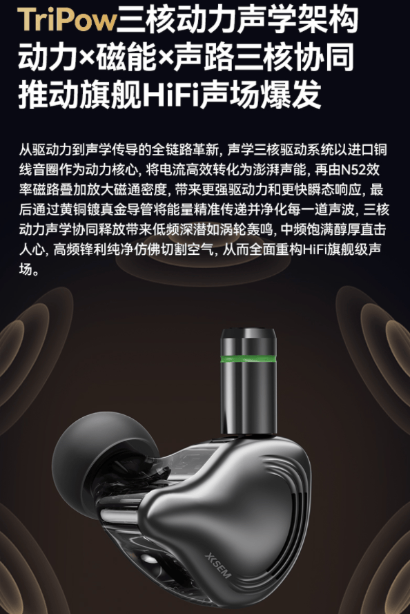 为了释放音质潜能,西圣HiFi耳机率先引入TriPow三核动力声学架构:采用进口铜线音圈作为动力核心,将输入的电能高效转化为澎湃的声能;搭配N52级高效磁路叠加放大磁通密度,进一步提升驱动力,使瞬态响应更快,声场表现更加开阔层次分明。最后,声音穿过精密黄铜镀真金导管传递出细腻而干净的音波,去除冗余噪声,为每一个频段提供精准的声音还原。