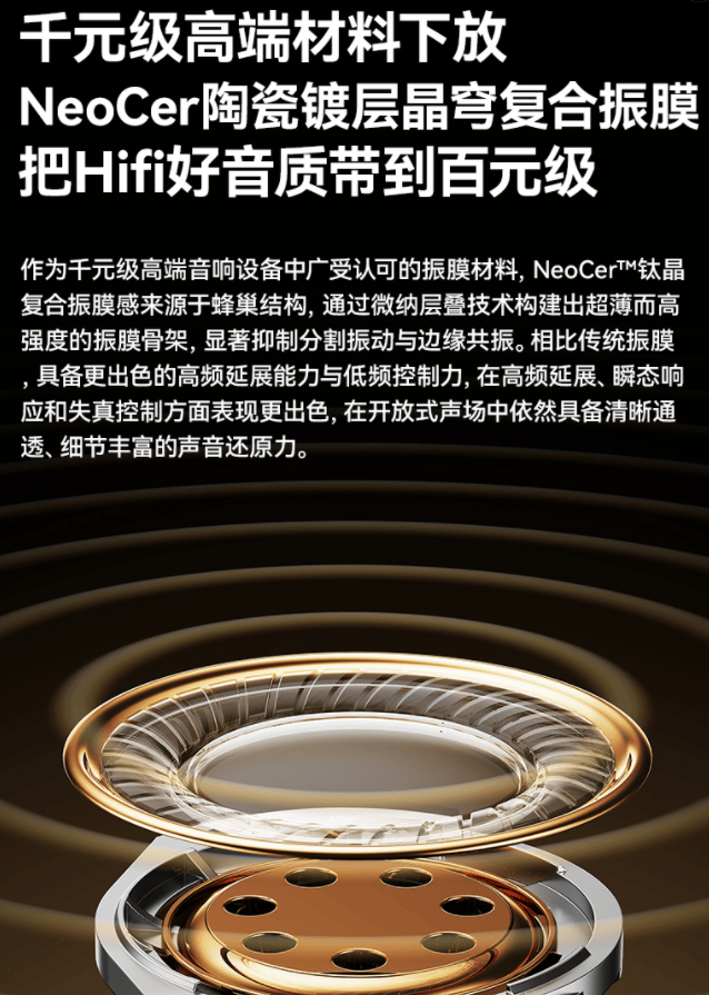 这款耳机采用 10mm双声环聚能单元、TriPow三核声学架构、NeoCer陶瓷镀层晶穹振膜 等多项先进声学技术,为声音解析力、动态表现和声场层次带来显著提升。一经发布,便被视作百元HiFi领域的新标杆。