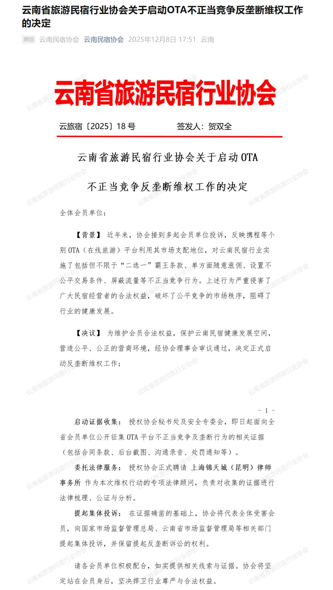 该协会发布的《关于启动OTA不正当竞争反垄断维权工作的决定》显示,接到多起会员单位投诉,反映携程等个别 OTA(在线旅游)平台利用其市场支配地位。
