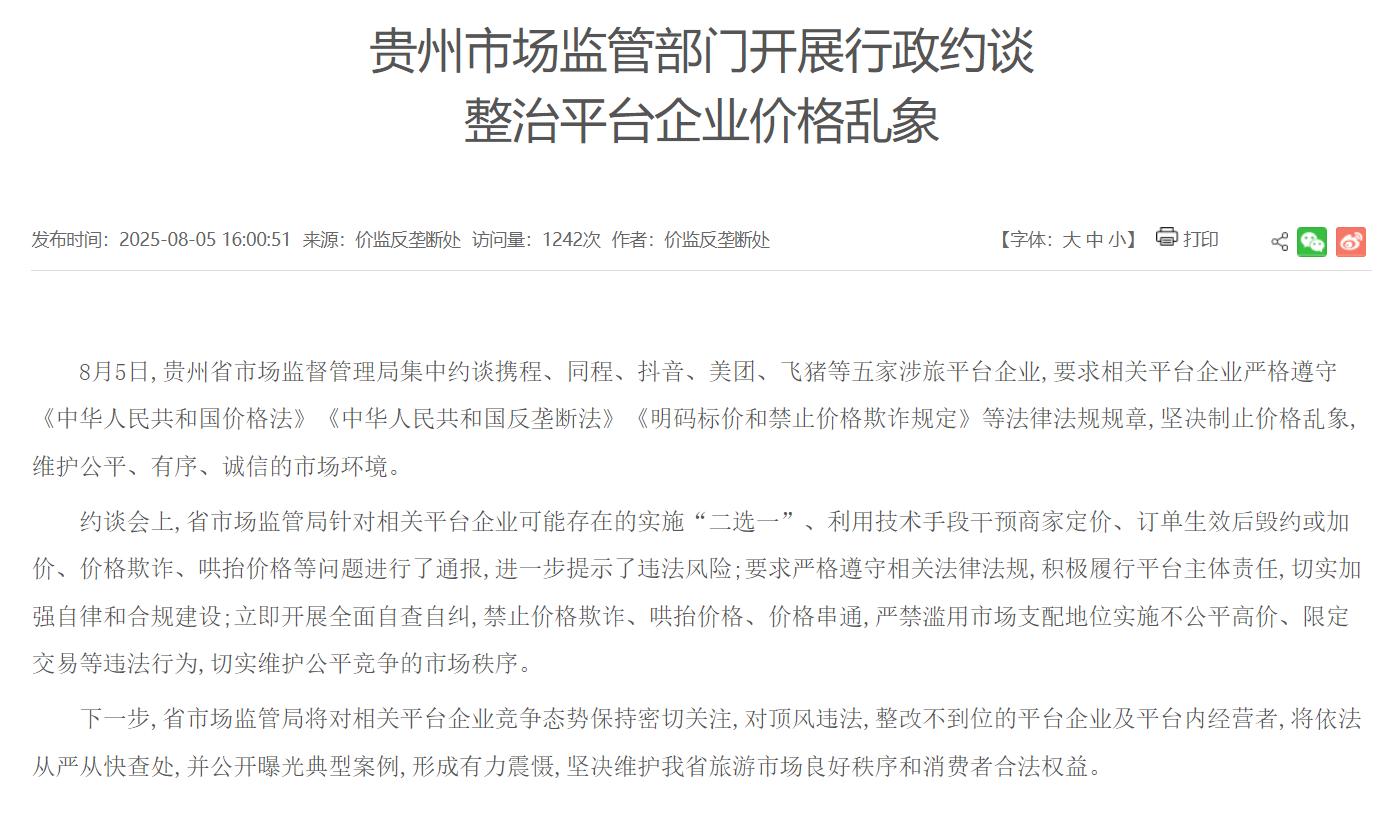 8月5日,贵州省市场监督管理局集中约谈携程等五家涉旅平台企业。