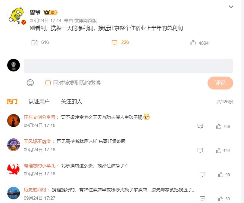 博主在文章中称携程赚得多,花的其实也更多了,它必须不断地在公域流量海洋里撒网,把那些昂贵的精准流量买回来,再分发给平台上的酒店。