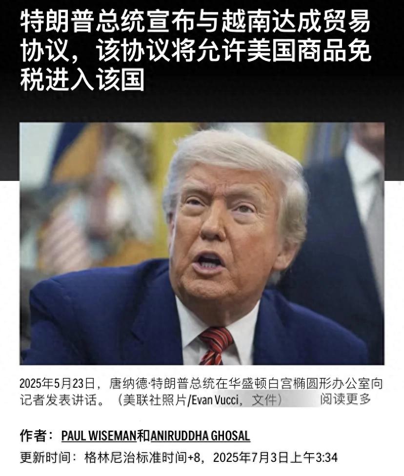 7月3日,特朗普在社交媒体发文说,经历几周的外交谈判之后,美越达成贸易协议。根据协议,越南对美国出口商品将被征收20%关税,转运货物将征收40%关税。而越南已同意取消对进口美国商品的所有关税。