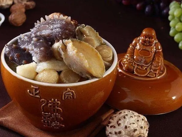佛跳墙的食材:佛跳墙的食材非常丰富,主要包括海参、鲍鱼、鱼肚、虾、螺蛳、香菇、冬笋、火腿等十几种食材。每一种食材都经过精心挑选,以保证其品质和口感。这些食材经过巧妙的烹饪工艺,互相渗透,相互融合,形成了佛跳墙独特而美妙的味道。佛跳墙的烹饪方法:佛跳墙的烹饪工艺繁琐而精细,需要耐心和技巧。