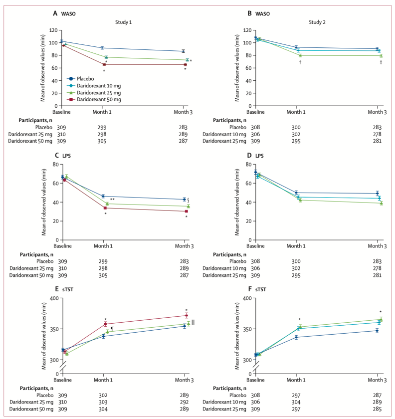 在《柳叶刀》两项全球多中心Ⅲ期临床试验中,服用达利雷生 50 毫克的患者,1 个月和 3 个月时夜间清醒时间减少 18–23 分钟,入睡时间提前 11–12 分钟,白天困倦感显著改善(IDSIQ 困倦评分降低约 1.8–1.9 分)。