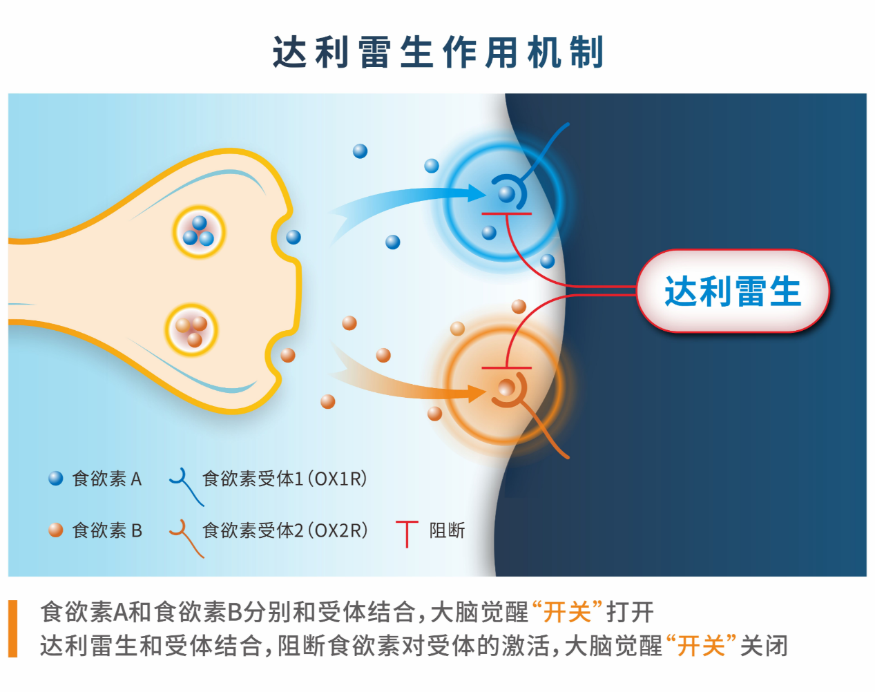 达利雷生作为一款创新的双重食欲素受体拮抗剂,其作用机制在于精准阻止食欲素神经肽(包括食欲素A和B)与其受体的结合,从而有效降低异常升高的食欲素水平,自然诱导睡眠状态。这种独特的作用途径不改变正常的睡眠生理结构,避免了传统药物广泛镇静大脑的弊端,在改善夜间睡眠质量的同时,更有助于提升患者白天的精神状态与功能表现,为破解失眠难题带来了全新的科学解决方案。