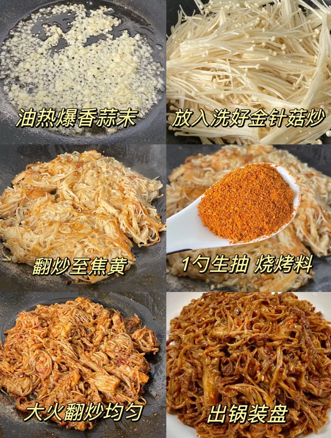 秘诀只有一句话:把金针菇当面条炒,让它在锅里“炸”出焦壳,再让烧烤料一秒穿味。听起来玄乎?其实比泡面还简单,全程只要一个平底不粘锅、一双筷子,连盐都不用放。