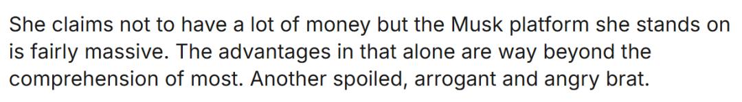 “她自称身无分文,但出身就决定了她已经站在马斯克搭建的庞大平台之上,仅此一项获得的关注就远超常人想象。不过是又一个被宠坏、傲慢又暴躁的富家子弟罢了。”