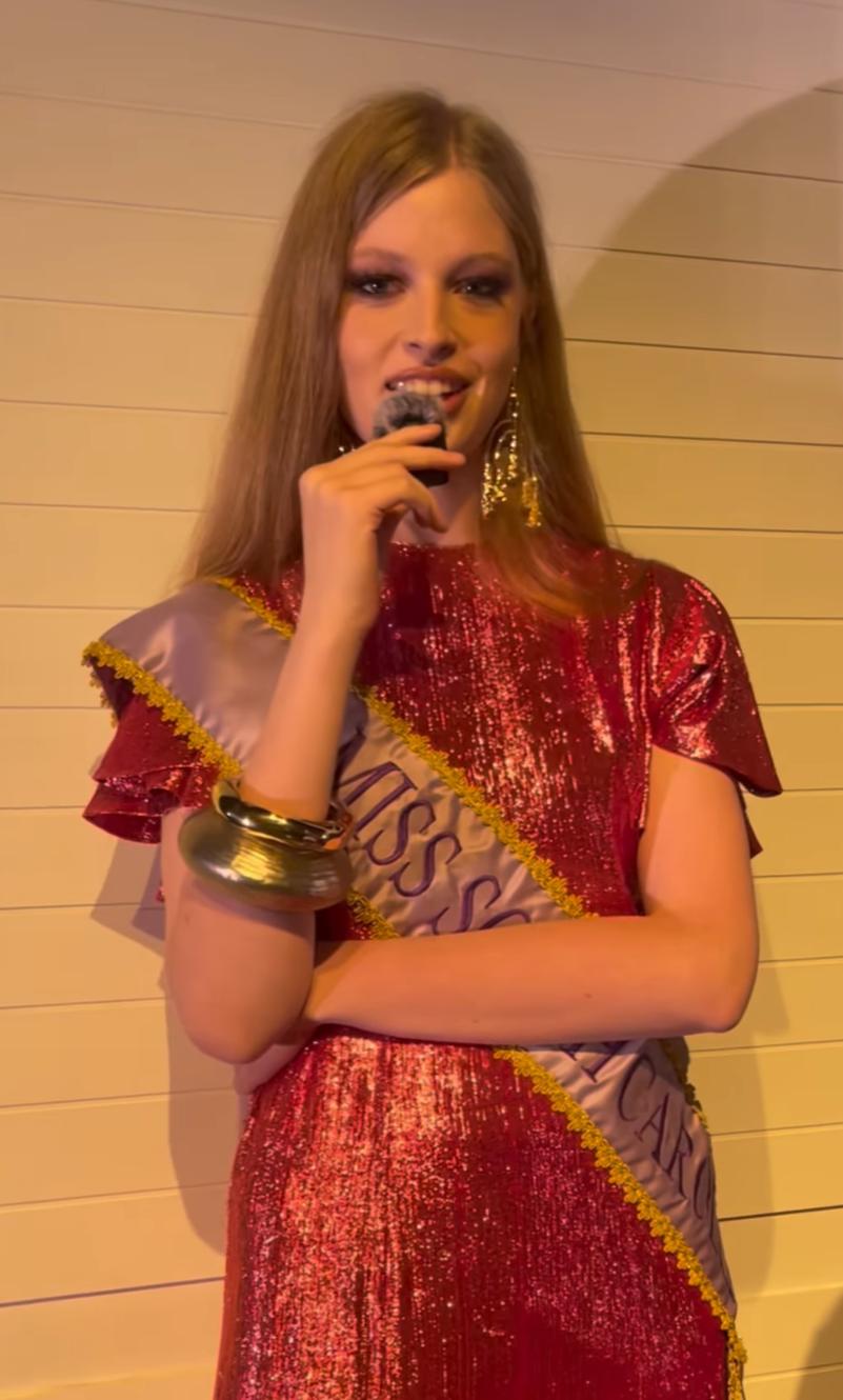 最受关注的是她最后一次亮相,穿了一身闪亮的红色短袖礼服,搭配一对超大的夸张金耳环和有剪刀元素的包包,以“南卡罗来纳州选美皇后”的身份走上舞台。
