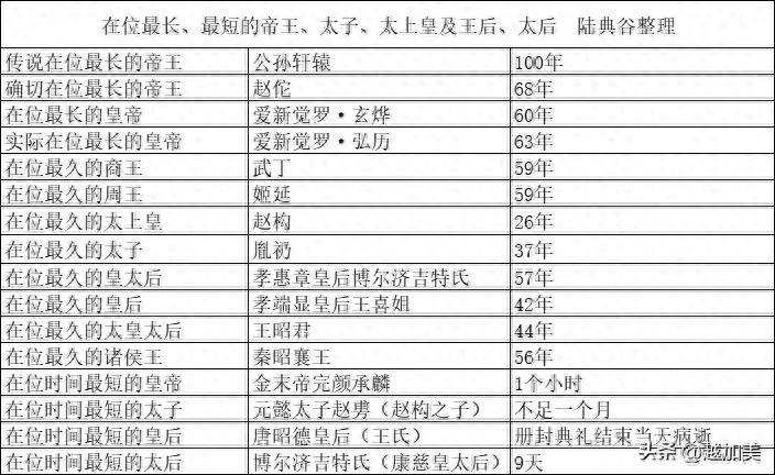 在位最长、最短的帝王、太子、太上皇及王后、太后,如下: