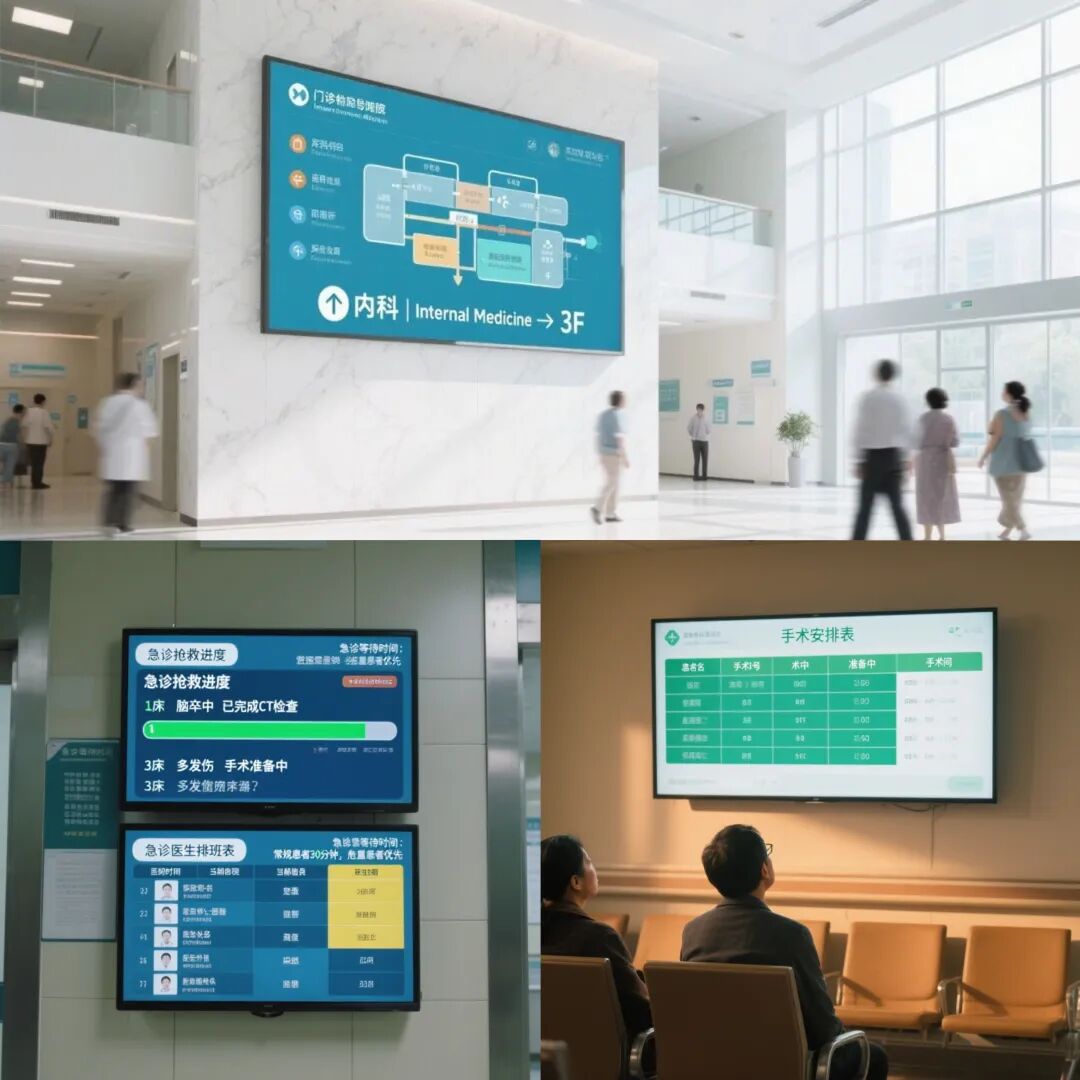 信息显示屏:布置在门诊大厅、急诊区、手术室外等场景,分别显示科室分布、医生排班、候诊队列、手术安排等信息,提供智能导诊服务。